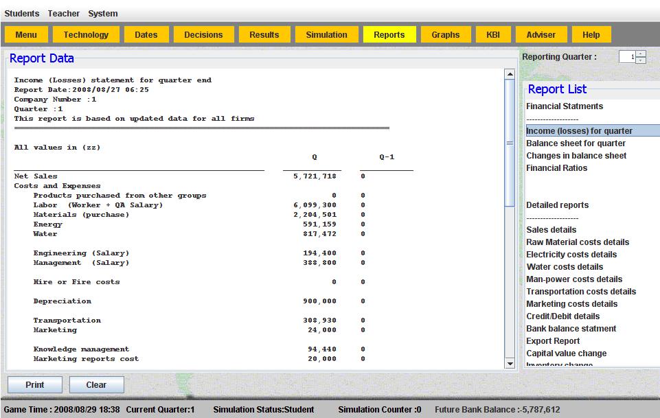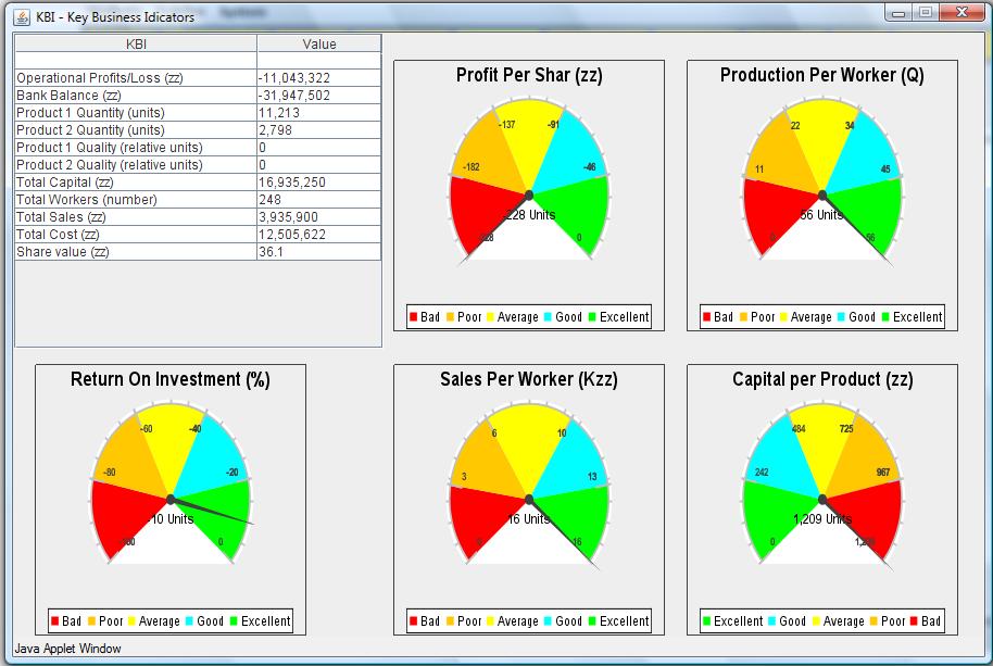 Business information and each firm's results are distributed to users with a set of graphs and reports. The graphs include market share, prices distribution, production cost, human resources, salaries and products quality. Reports include P&L, balance sheet, financial indicators and detailed managerial reports.