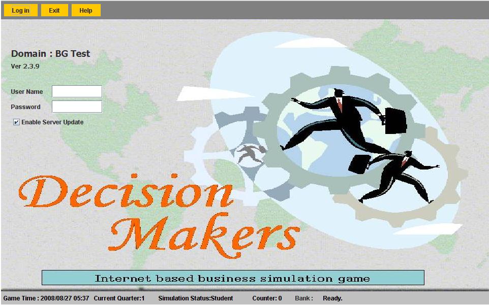 The Decision Makers set of models includes management of raw materials , production management,budgeting of core capital , transportation optimization,selection of marketing channels and final product pricing. Sales include domestic and international with multi currency sales. The simulation includes models of the firm's share value that reflects investor's estimation for firm share value. Management performance is reported by a set of financial and managerial reports which are based on accounting standards.