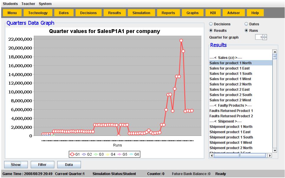 The teacher's account (password protected) has full control over the simulation game. This includes setting the start and end time of each quarter, setting the main economic parameters such as interest rate(s), demand, customer's preferences, technology characteristics and exchange rate(s). The teacher may also monitor the progress of each player using a simple graphic user interface.